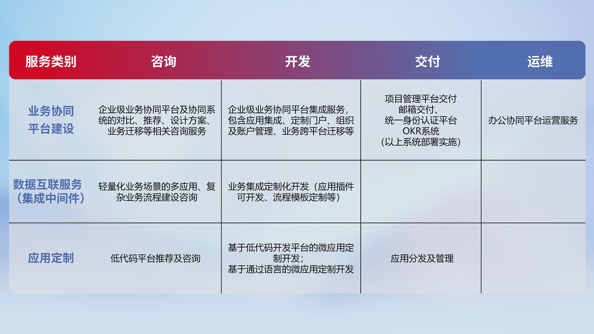 针对钉钉、、企微、、IDaas等平台级产品提供产品的规划、、、、方案、、、交付、、、、定制化开发等服务,,,实现如统一协同办公、、、、智能客户服务、、、混合会议管理、、、智能数据查询、、、、等业务场景,,实现数字化转型。。。。