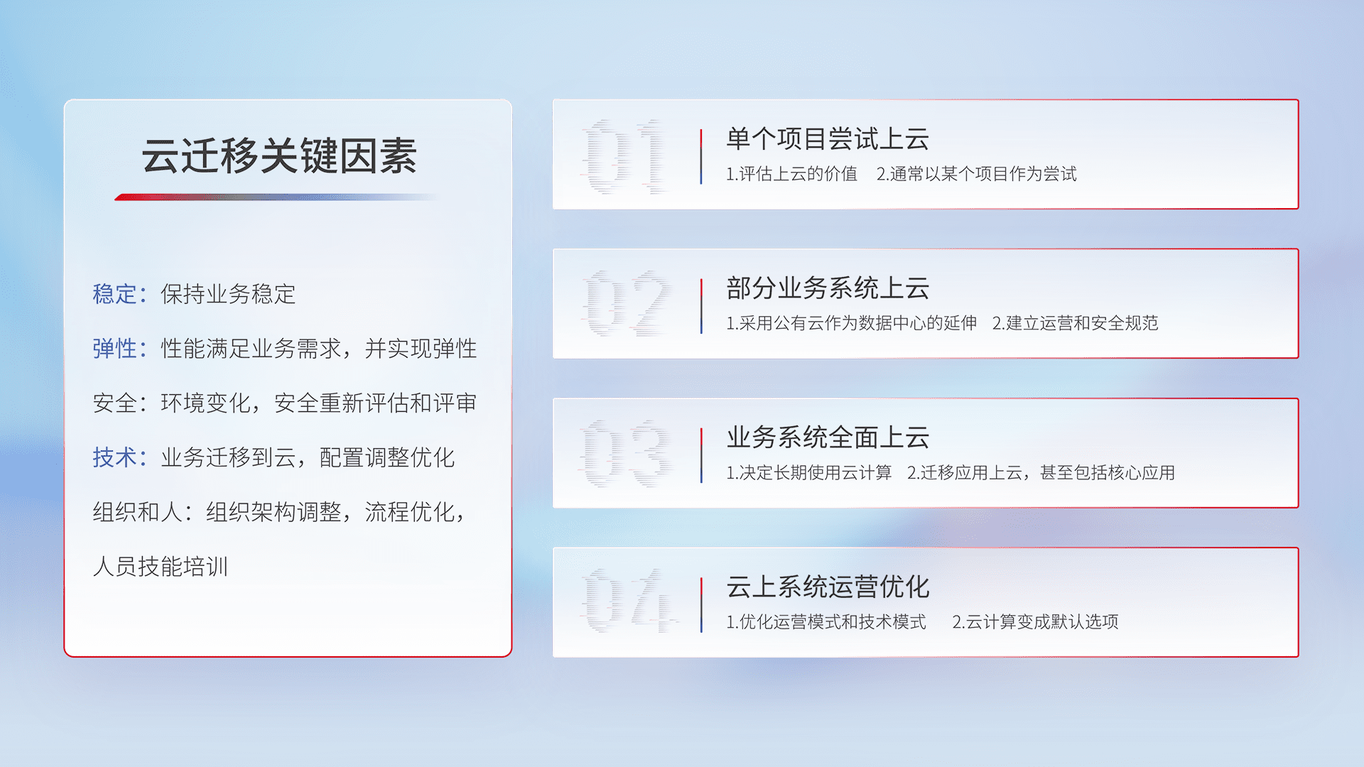结合实际业务,,,从规划设计、、云平台选型、、、云原生改造、、数据迁移、、、集成交付,,,,迁移全过程为客户识别最佳上云路径,,,,做好风险识别管理,,设计网络架构、、、身份权限、、、安全审计合规、、、操作审计、、日志审计、、监控告警策略、、多站点容灾设计等,,对云上基础设施进行整体规划,,,提升IT治理水平,,,,以满足弹性、、、高可用、、高性能的需求。。