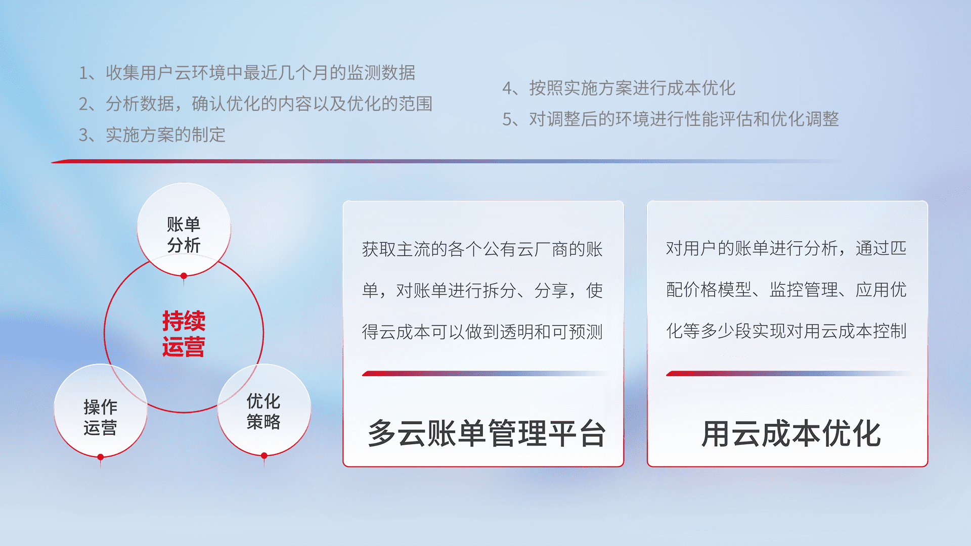 通过多云纳管,,,以统一的资源数据模型把客户的云资源进行抽象和封装,,,,进而实现对多云资源的统一操作,,,保障云资源管理的可靠性、、、稳定性与可用性。。。。量身定制化运维内容,,,,配置、、开发运维、、补丁管理、、、备份、、、、监控、、认证和访问管理、、、、审计和日常巡检等,,,保障在用云过程中的可靠度,,,稳定度以及高可用率。。。。